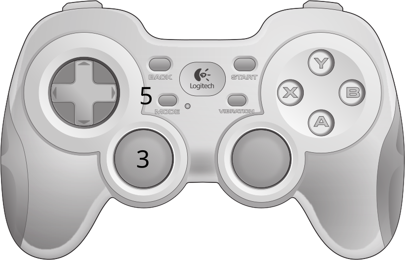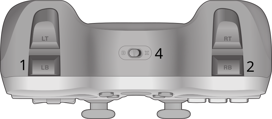 Rear of the controller. Ensure switch 4 is set to X. Hold LB (1) for slow driving, hold RB (2) for fast driving.
